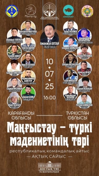 10 июля в городе Актау состоится республиканский командный айтыс под названием «Маңғыстау - түркі мәдениетінің төрі». Айтыс начнётся в 10:00 в Доме дружбы, расположенном в 34-м микрорайоне.